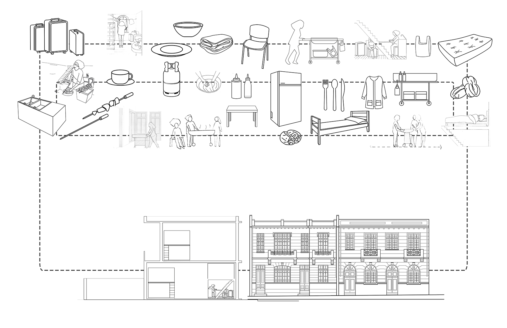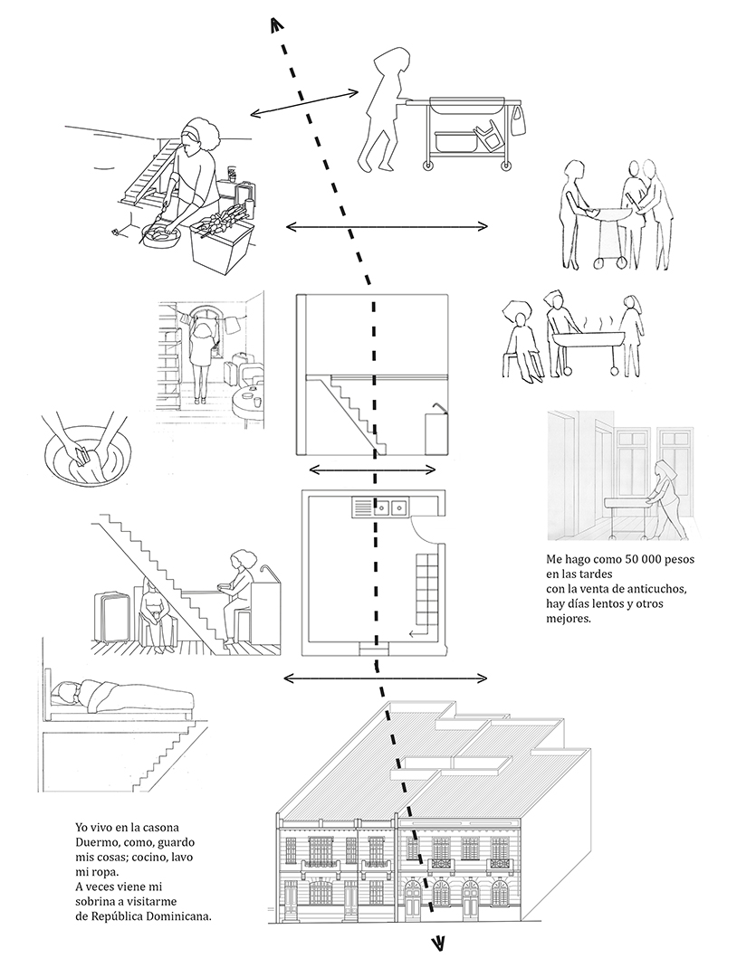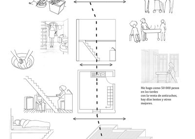 El material expone los resultados de una investigación sobre las resignificaciones espaciales que experimentan viviendas preexistentes de Santiago con la llegada de personas migrantes. La secuencia visual sintetiza y da a conocer la espacialización de la vida en las edificaciones y su relación con prácticas constitutivas de los proyectos de movilidad de sus habitantes. En artículo publicado en Revista de Geografía Espacios, Universidad Academia de Humanismo Cristiano. Santiago, Chile, 2022.