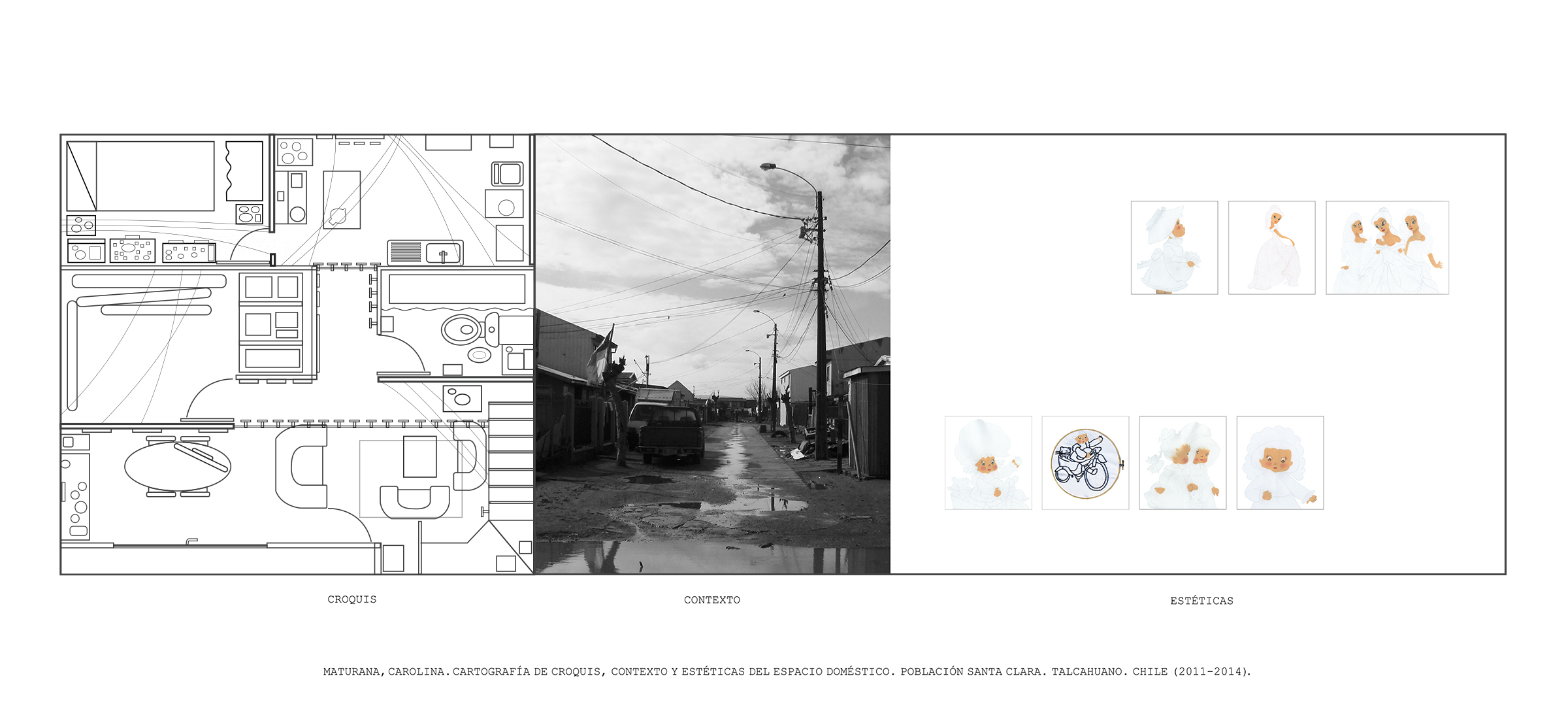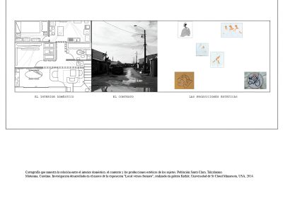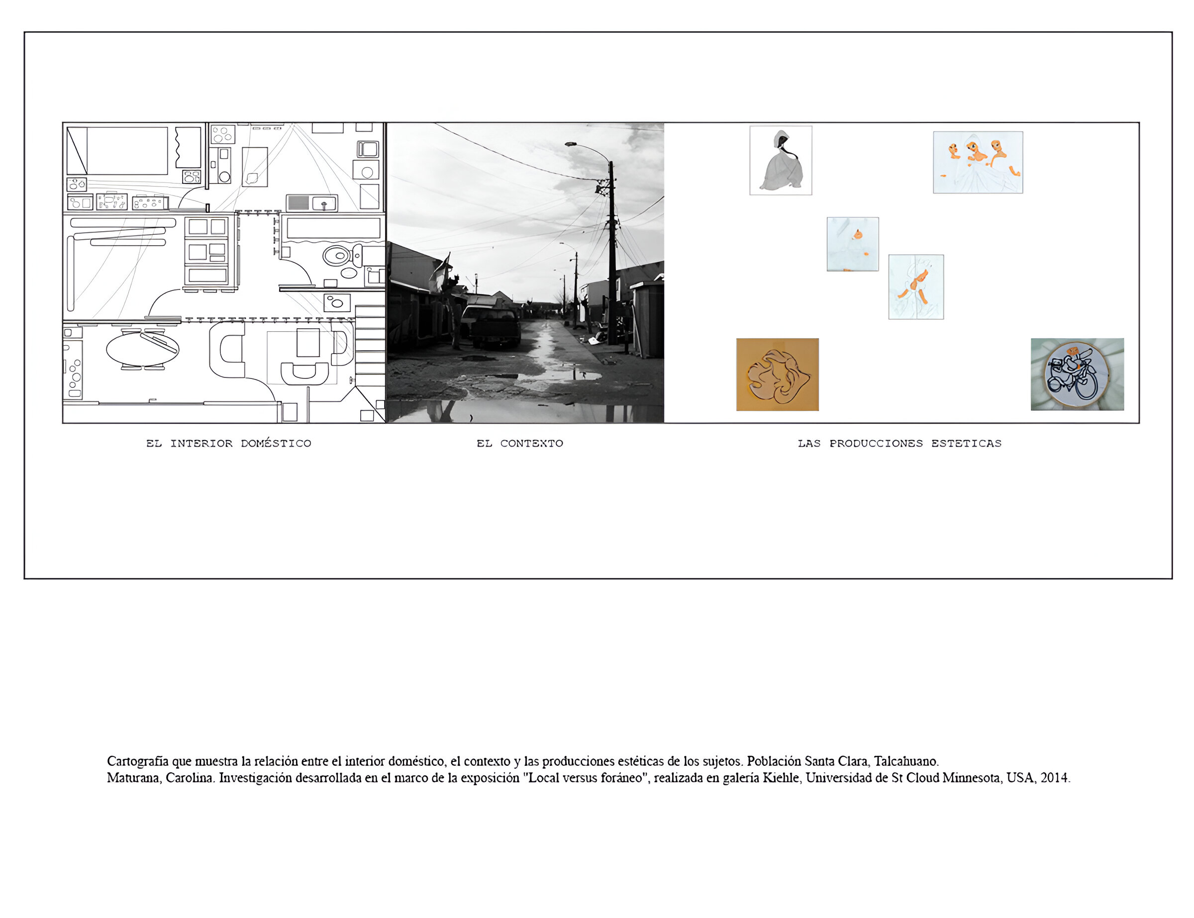 Desarrollada en el marco de la exposición Local v/s Foráneo, realizada en Galería Kiehle, St. Cloud Minnesota, USA, 2014. Difunde los resultados de una investigación etnográfica sobre las tensiones que se establecen entre las características socioespaciales de las viviendas de un grupo de pobladoras de contextos suburbanos de Concepción y Talcahuano, Región del Biobío, el contexto de pobreza de las mismas y las estéticas foráneas que incorporan las mujeres a las manualidades que crean para aumentar el ingreso familiar. Impresión en papel presentación, 106cm x 200cm formato extendido, 27,5cm x 40,5cm x 0,5cm de fondo formato plegado, 4/4 color.