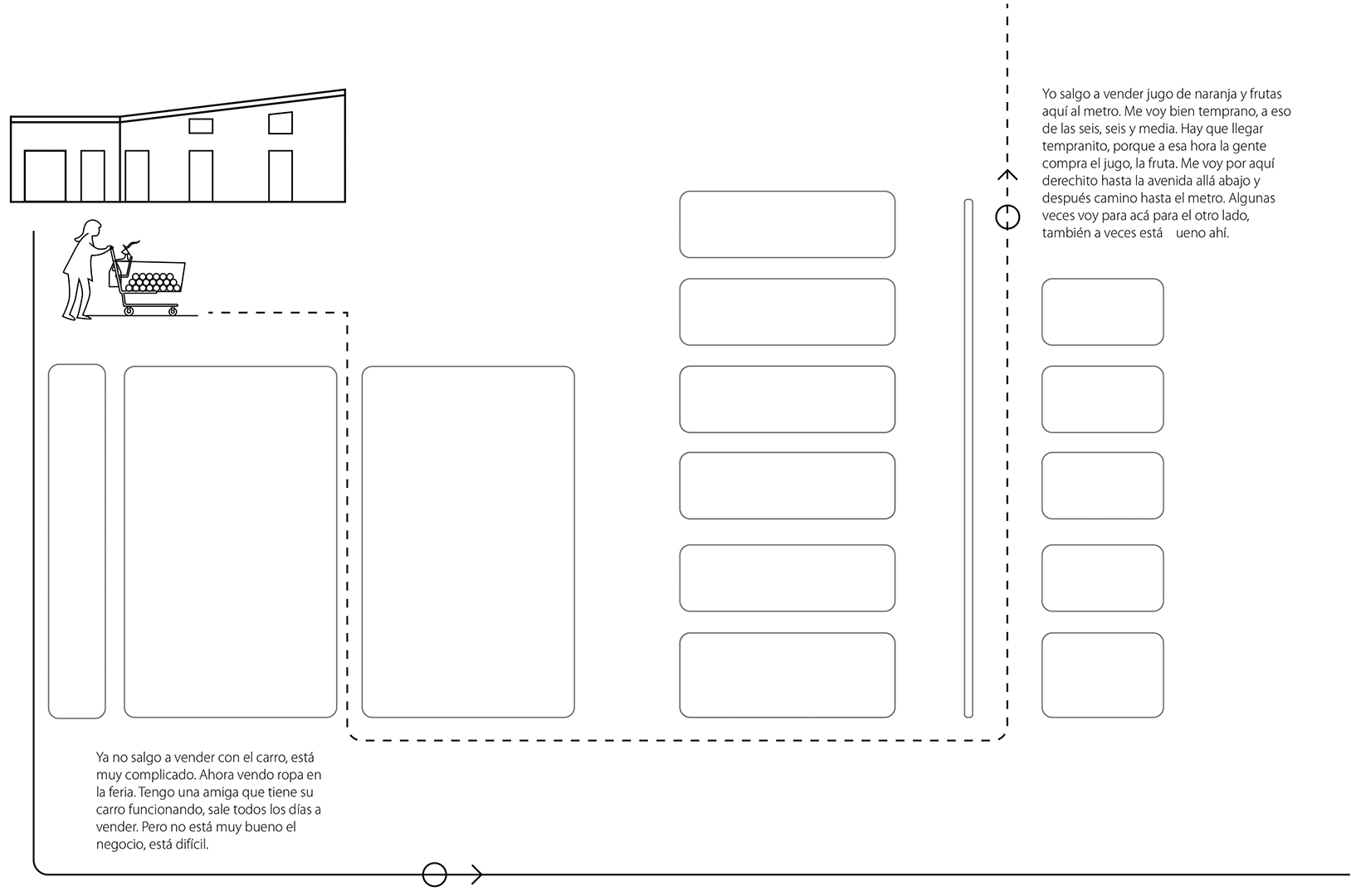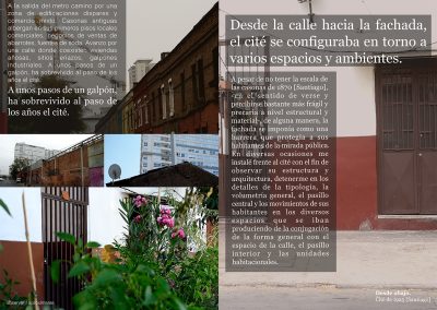 Por medio de una narrativa visual continua se dan a conocer las principales operaciones metodológicas y resultados de la tesis doctoral para optar al grado académico de Doctor en Arquitectura y Estudios Urbanos, Pontificia Universidad Católica de Chile (2014-2020). Los productos sitúan al lector en la posición y actuación que tuvo que asumir la investigadora a lo largo del estudio, para luego ponerlo a distancia y desde fuera, analizar el recorrido y responder a las preguntas de investigación.