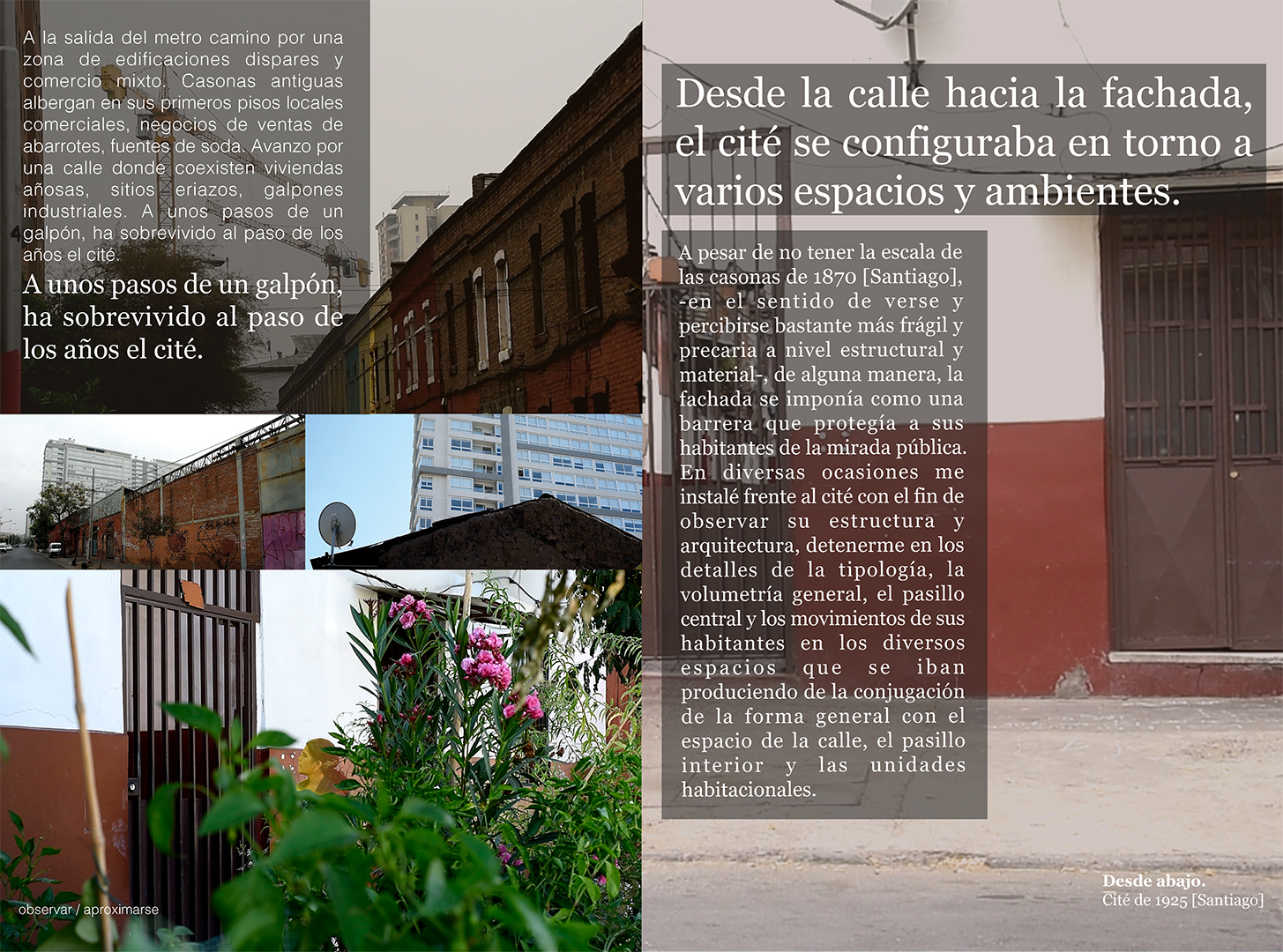 Desde abajo, dan a conocer las estrategias metodológicas de observar/ aproximarse y aproximarse/ merodear. Impresión en papel presentación, 42cm x 29,7cm formato extendido, 4/4 color.