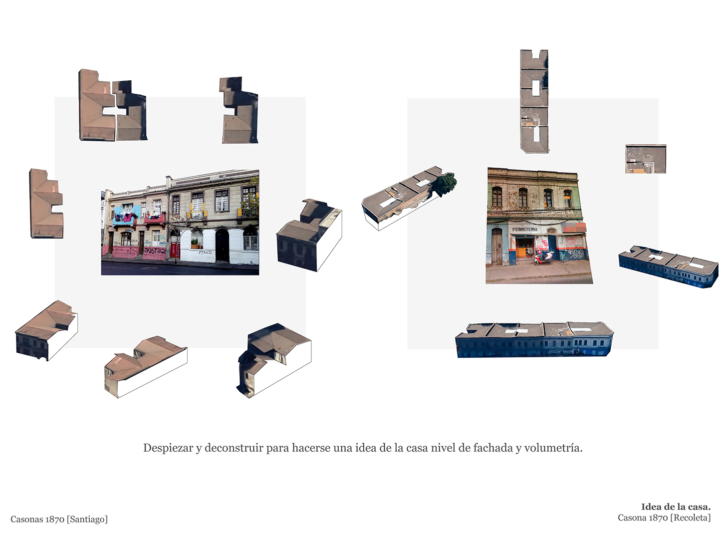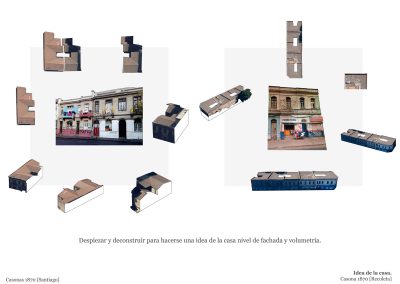 Idea de la casa, da a conocer la técnica metodológica despiezar y deconstruir, que permite hacerse una idea de la casa a nivel de fachada y volumetría. Impresión en papel presentación, 42cm x 29,7cm formato extendido, 4/4 color.